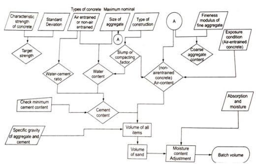 The ACI method of mixed design is included in the section of guidelines published by the American Concrete Institute (ACI) in 1991. The guidelines were prepared for heavy-weight, normal and mass concrete mix design. The design steps are presented in the form of schematic flow chart as recommended by ACI Committee 211. This method is suitable for compressive strength of 45 MPa (28-day strength) and slump range for workability 25 to 100mm. ACI gave a table depicting relationship between nominal maximum aggregate size, slump desired and air entrainment to the required mixing water quantity.