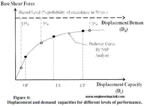 he displacement demands corresponding to various seismic hazard levels when combined with various performance levels, provides the information about the risk associated with a particular design. Fig. 4 represents the Displacement Capacities (Dc) corresponding to various performance levels and the Displacement Demands (Dd) for various hazard levels. When the displacement demands (Dd) are less than the displacement capacities (Dc) i.e. when Dc/Dd ratio is 1.0 or greater, then the performance objectives are achieved for such structures. In Fig. 4 if three performance levels OP, LS and CP are considered, then it is clear that the structure satisfies the performance objectives for OP and LS levels but fails to achieve the performance corresponding to CP performance level.